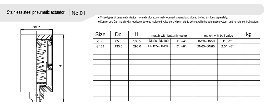 V: Peamised tüübid on ühe- ja kahetoimelised pneumaatilised ajamid, mis on valitud ohutusnõuete ja töötingimuste töösageduse alusel: ① Kahetoimeline täiturmehhanism: kahe õhuallikaga töötav ventiil avaneb ja sulgub stabiilselt kiire reageerimisega, sobib tavapärastes sanitaartöötingimustes automaatsete tootmisliinidega ja välise allikaga varustatud kõrgsagedusliku juhtimisega; ② Ühetoimeline täiturmehhanism: vedrutagastuskonstruktsiooniga, mida juhib ühel küljel õhu sisselaskeava ja lähtestatakse automaatselt (avatakse/sulgetakse) pärast õhukadu, on sellel kõrge ohutus- ja kaitsejõudlus, mis sobib kõrge riskiga sanitaartöötingimustesse, kus keskkond on tuleohtlik, mürgine ja söövitav, ning suudab tõhusalt vältida torujuhtme ohutusriske pärast õhuallika riket.